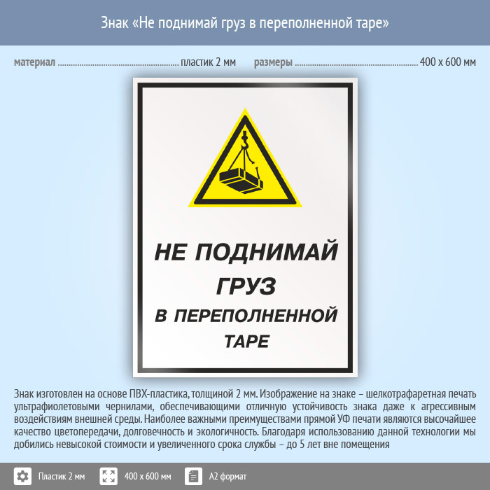 Знак «Не поднимай груз в переполненной таре», КЗ-26 (пластик, 400х600 мм) в Лобне купить