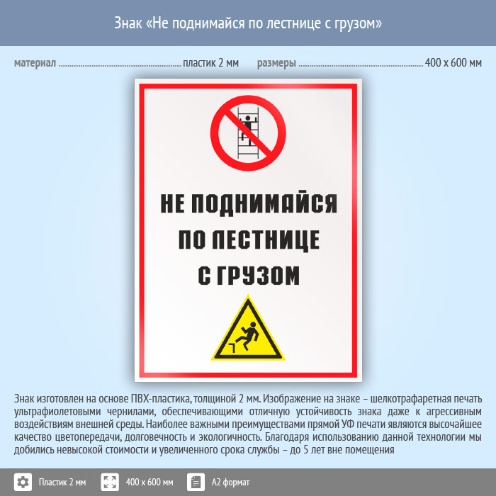 Знак «Не поднимайся по лестнице с грузом», КЗ-28 (пластик, 400х600 мм) в Лобне купить