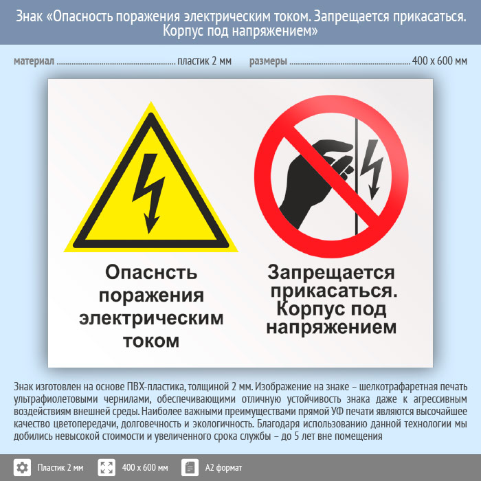 Знак «Опасность поражения электрическим током. Запрещается прикасаться. Корпус под напряжением», КЗ-47 (пластик, 600х400 мм) в Лобне купить
