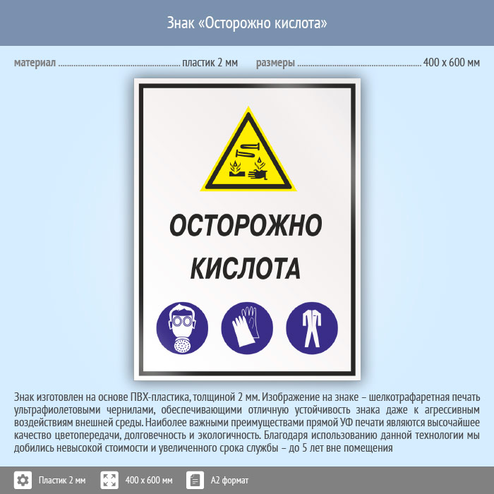 Знак «Осторожно кислота», КЗ-61 (пластик, 400х600 мм) в Лобне купить