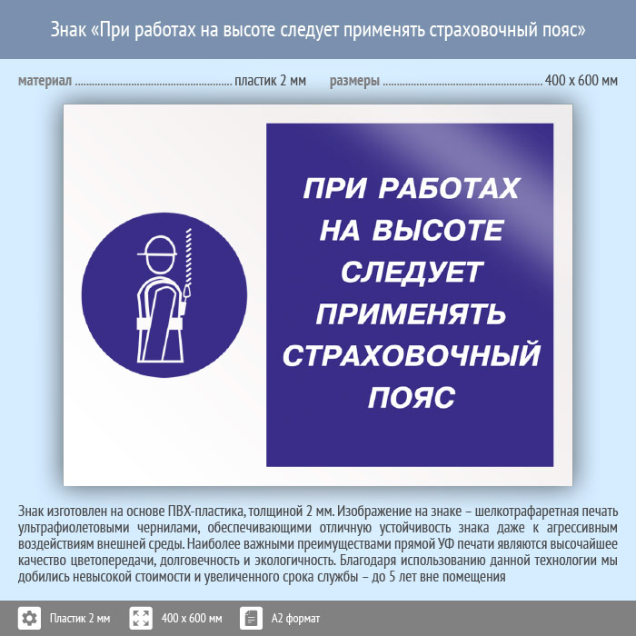 Знак «При работах на высоте следует применять страховочный пояс», КЗ-75 (пластик, 600х400 мм) в Лобне купить