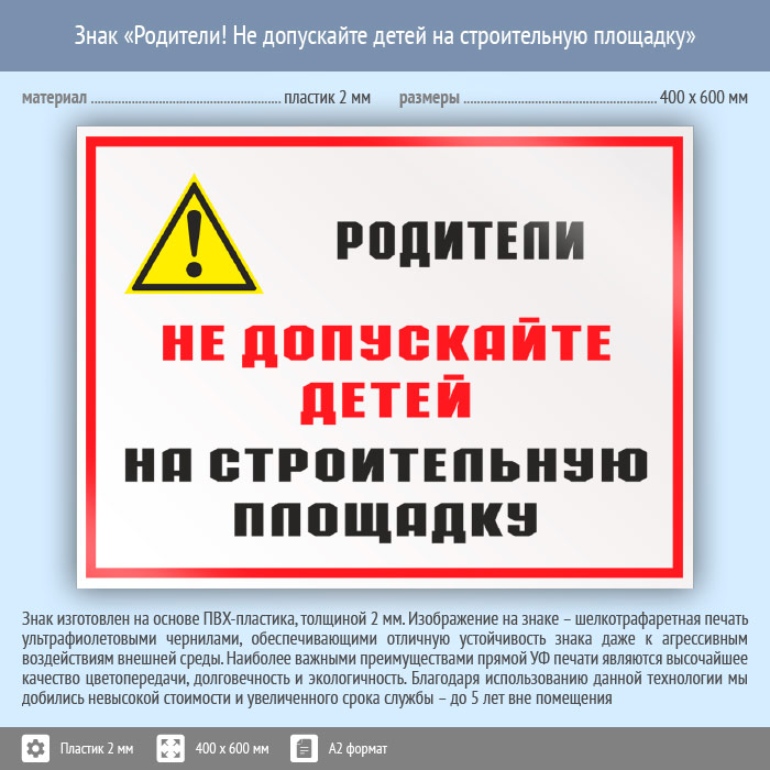 Знак «Родители! Не допускайте детей на строительную площадку», КЗ-84 (пластик, 600х400 мм) в Лобне купить