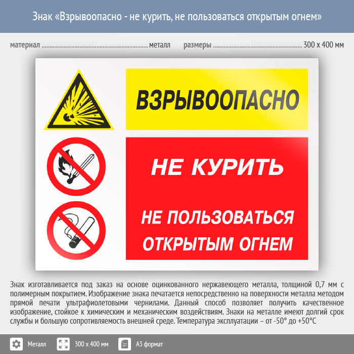 Знак «Взрывоопасно - не курить, не пользоваться открытым огнем», КЗ-05 (металл, 400х300 мм) в Лобне купить