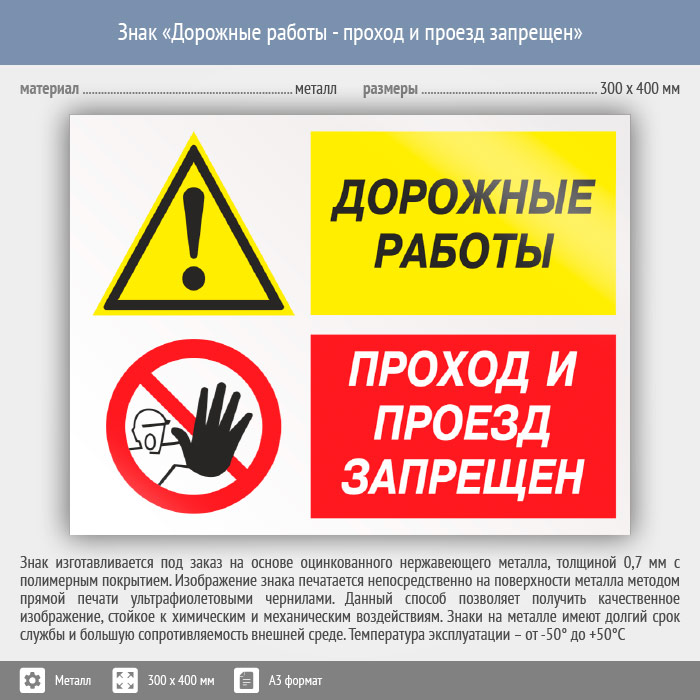 Знак «Дорожные работы - проход и проезд запрещен», КЗ-20 (металл, 400х300 мм) в Лобне купить