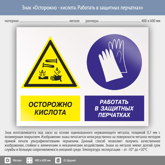 Знак «Осторожно - кислота. Работать в защитных перчатках», КЗ-56 (металл, 600х400 мм) в Лобне купить