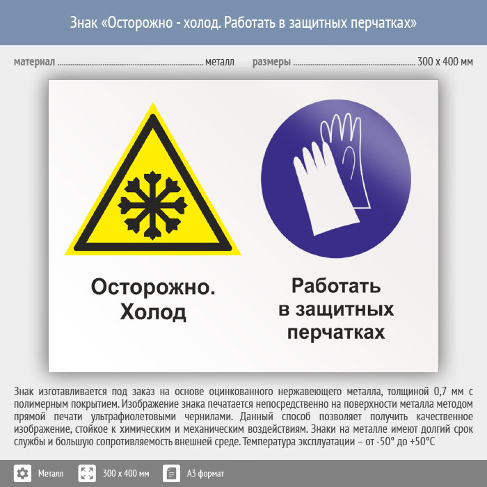 Знак «Осторожно - холод. Работать в защитных перчатках», КЗ-59 (металл, 400х300 мм) в Лобне купить