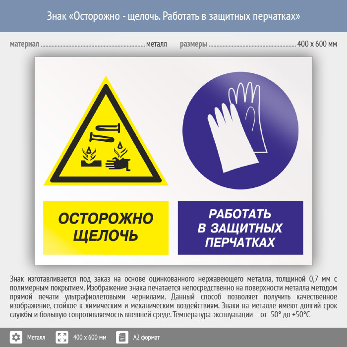 Знак «Осторожно - щелочь. Работать в защитных перчатках», КЗ-60 (металл, 600х400 мм) в Лобне купить