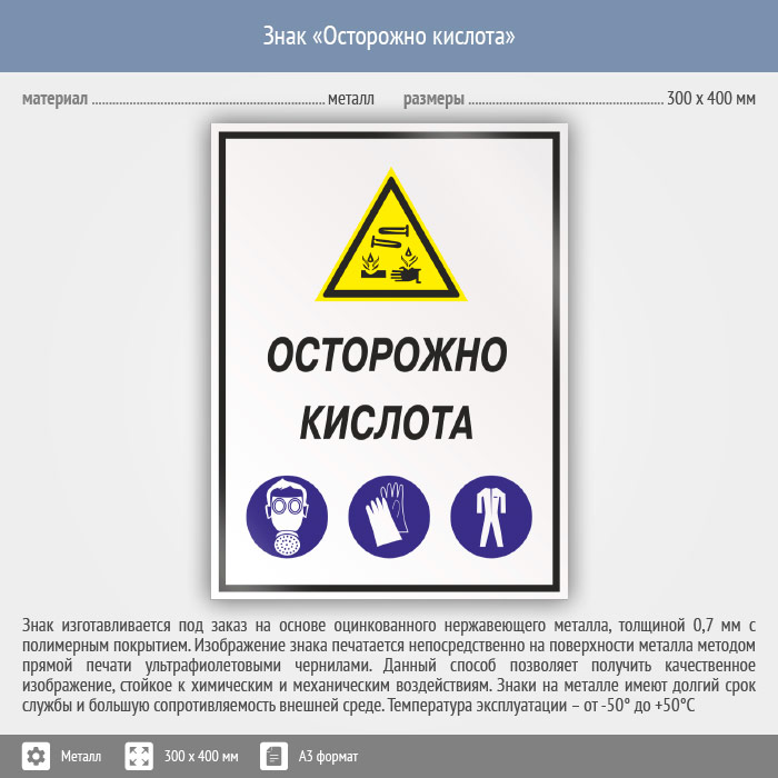 Знак «Осторожно кислота», КЗ-61 (металл, 300х400 мм) в Лобне купить