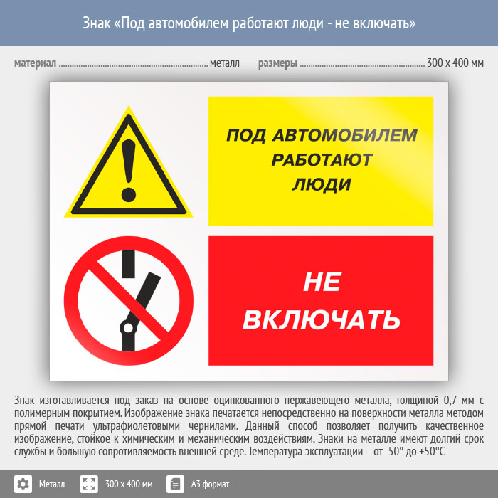 Знак «Под автомобилем работают люди - не включать», КЗ-65 (металл, 400х300 мм) в Лобне купить