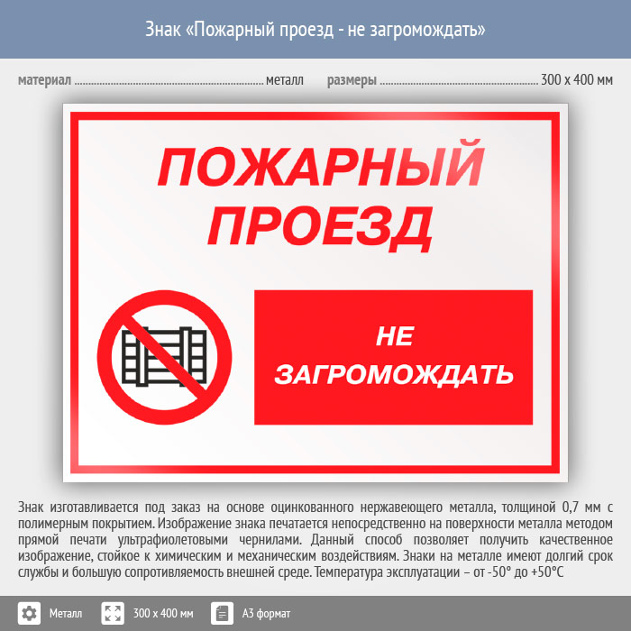 Знак «Пожарный проезд - не загромождать», КЗ-67 (металл, 400х300 мм) в Лобне купить