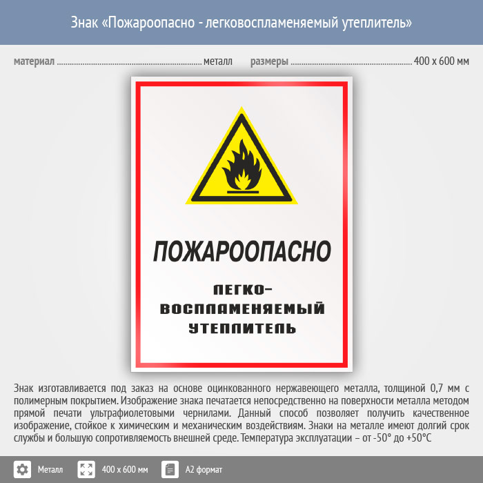 Знак «Пожароопасно - легковоспламеняемый утеплитель», КЗ-68 (металл, 400х600 мм) в Лобне купить