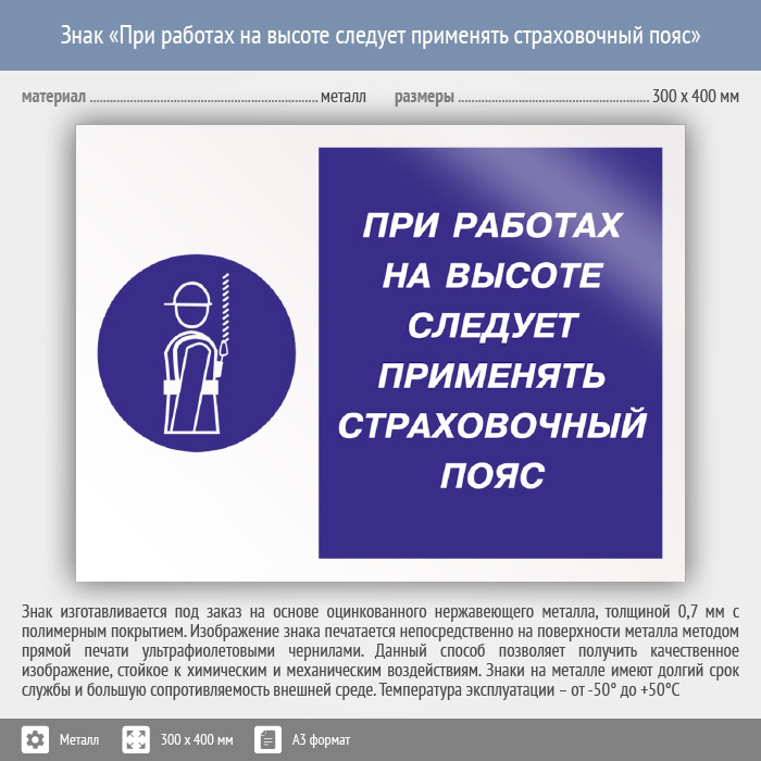 Знак «При работах на высоте следует применять страховочный пояс», КЗ-75 (металл, 400х300 мм) в Лобне купить