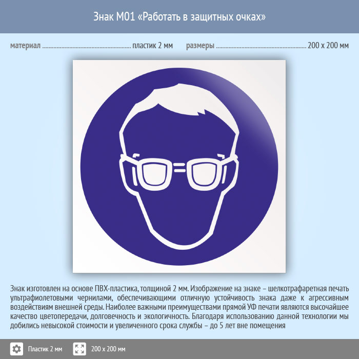 Знак M01 «Работать в защитных очках» (пластик, 200х200 мм) в Лобне купить