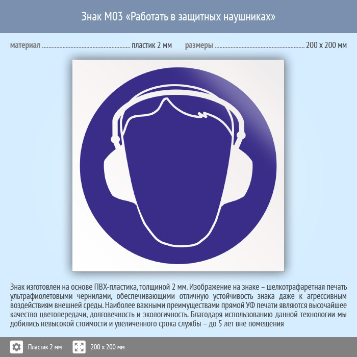 Знак M03 «Работать в защитных наушниках» (пластик, 200х200 мм) в Лобне купить