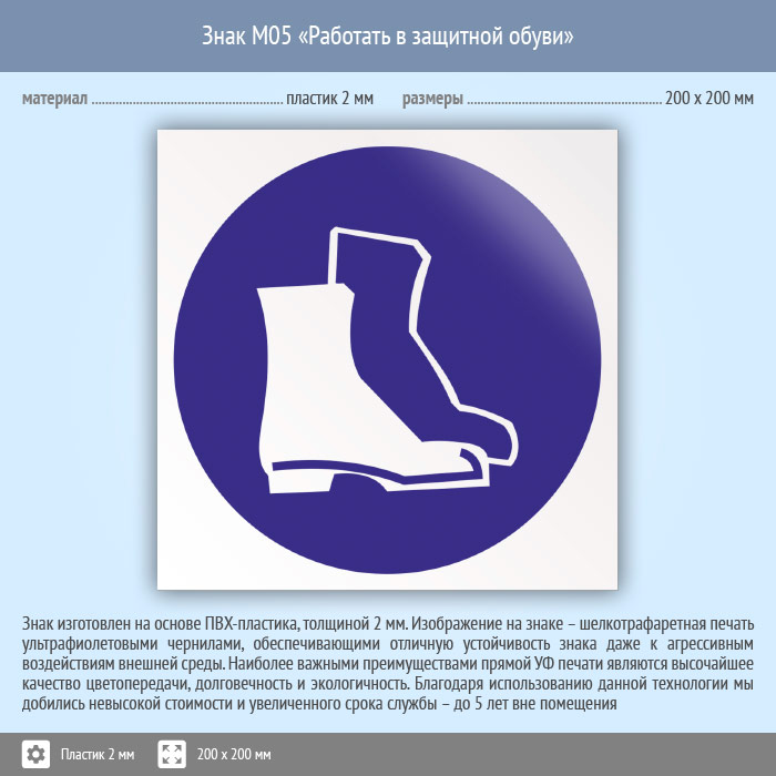 Знак M05 «Работать в защитной обуви» (пластик, 200х200 мм) в Лобне купить