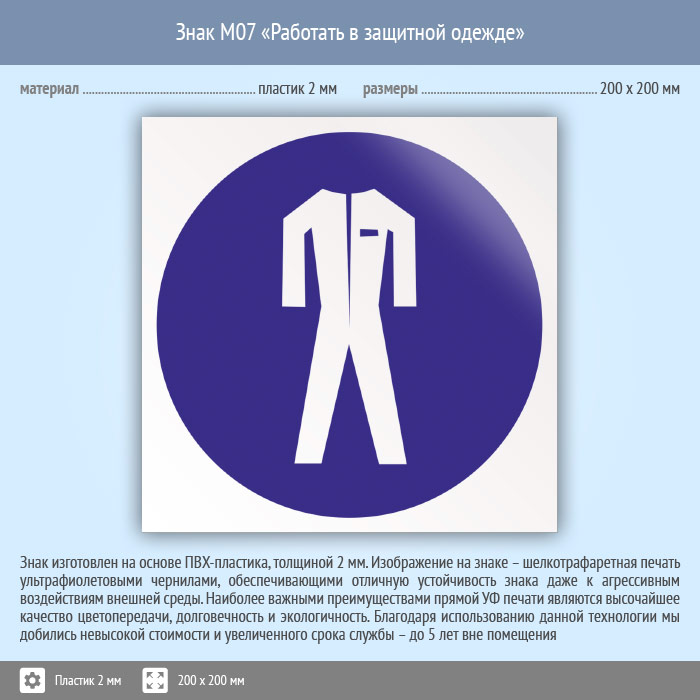 Знак M07 «Работать в защитной одежде» (пластик, 200х200 мм) в Лобне купить