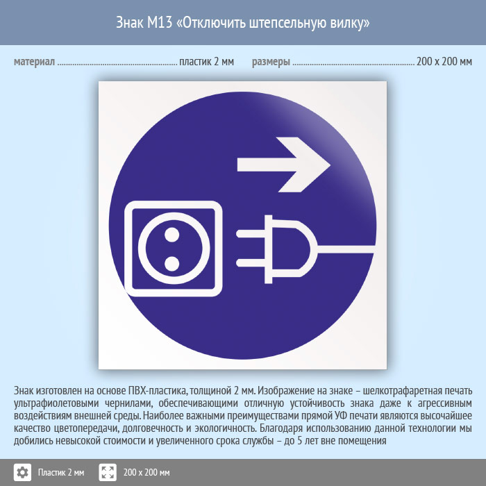 Знак M13 «Отключить штепсельную вилку» (пластик, 200х200 мм) в Лобне купить