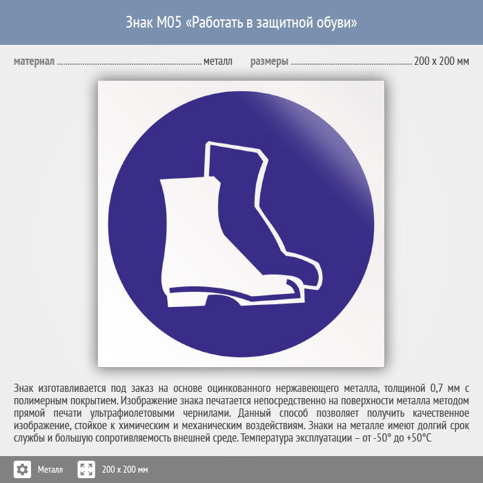 Знак M05 «Работать в защитной обуви» (металл, 200х200 мм) в Лобне купить