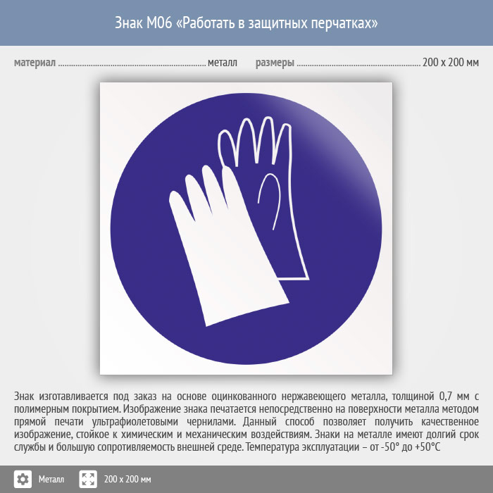 Знак M06 «Работать в защитных перчатках» (металл, 200х200 мм) в Лобне купить