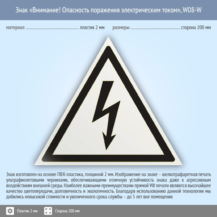 Знак W08-W «Внимание! опасность поражения электрическим током» (белый, пластик, сторона 200 мм) в Лобне купить