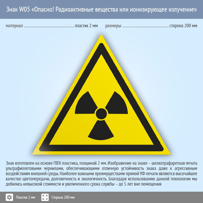 Знак W05 «Опасно! радиоактивные вещества или ионизирующее излучение» (пластик, сторона 200 мм) в Лобне купить