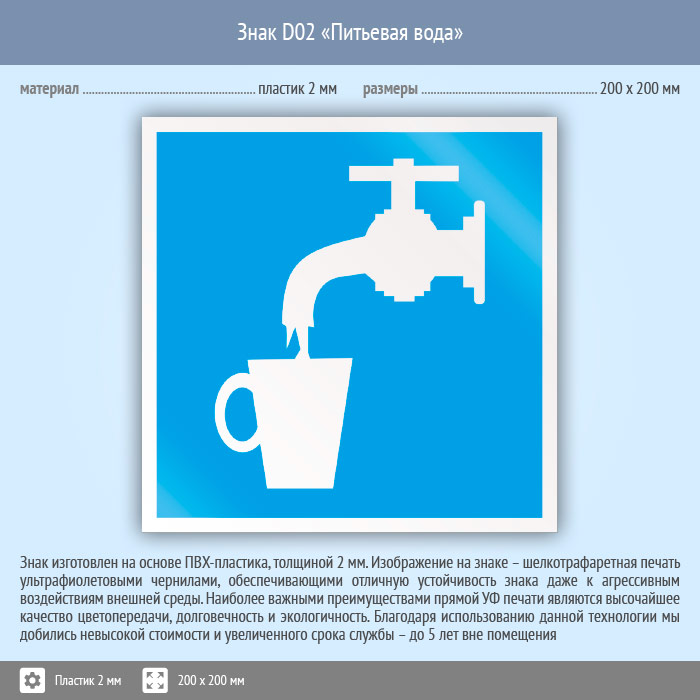 Знак D02 «Питьевая вода» (пластик, 200х200 мм) в Лобне купить