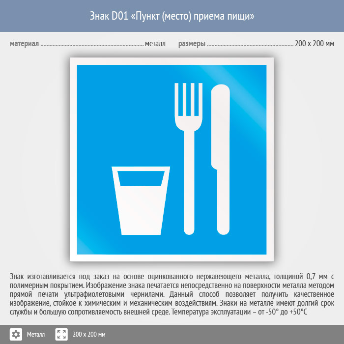 Знак D01 «Пункт (место) приема пищи» (металл, 200х200 мм) в Лобне купить