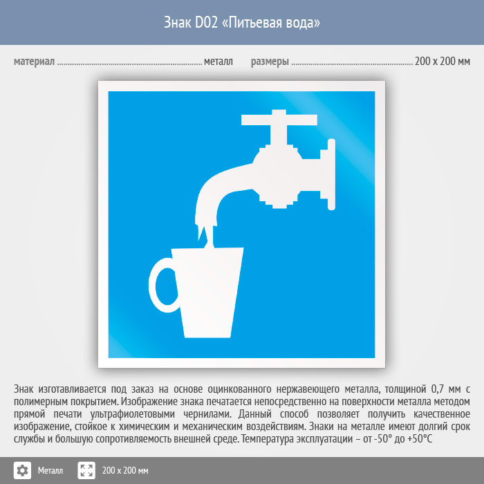Знак D02 «Питьевая вода» (металл, 200х200 мм) в Лобне купить