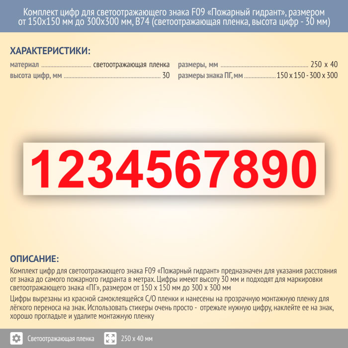 Комплект цифр для светоотражающего знака F09 «Пожарный гидрант», размером от 150х150 мм до 300х300 мм, В74 (светоотражающая пленка, 250х40 мм, высота цифр - 30 мм) в Лобне купить