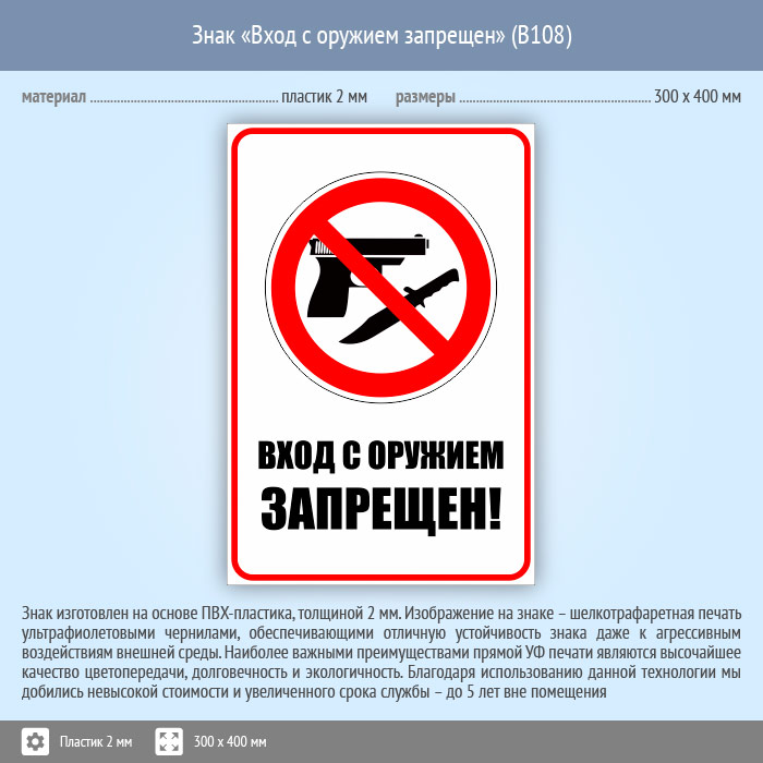 Знак «Вход с оружием запрещен», B108 (пластик, 300х400 мм) в Лобне купить