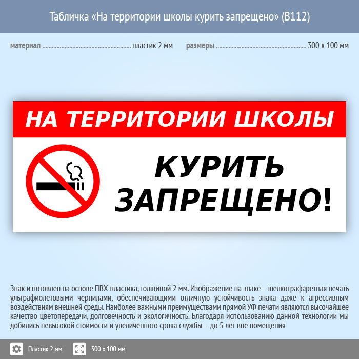 Табличка «На территории школы курить запрещено», B112 (пластик, 300х100 мм) в Лобне купить