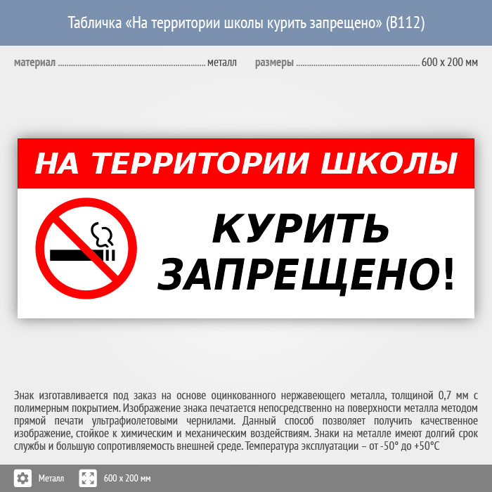 Табличка «На территории школы курить запрещено», B112 (металл, 600х200 мм) в Лобне купить