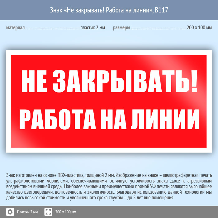 Знак «Не закрывать! Работа на линии», B117 (пластик, 200х100 мм) в Лобне купить