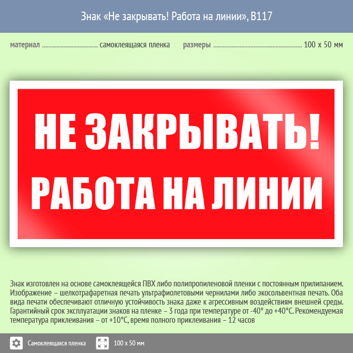 Знак «Не закрывать! Работа на линии», B117 (пленка, 100х50 мм) в Лобне купить