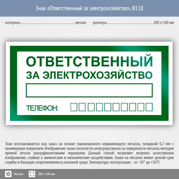 Знак «Ответственный за электрохозяйство», B118 (металл, 200х100 мм) в Лобне купить