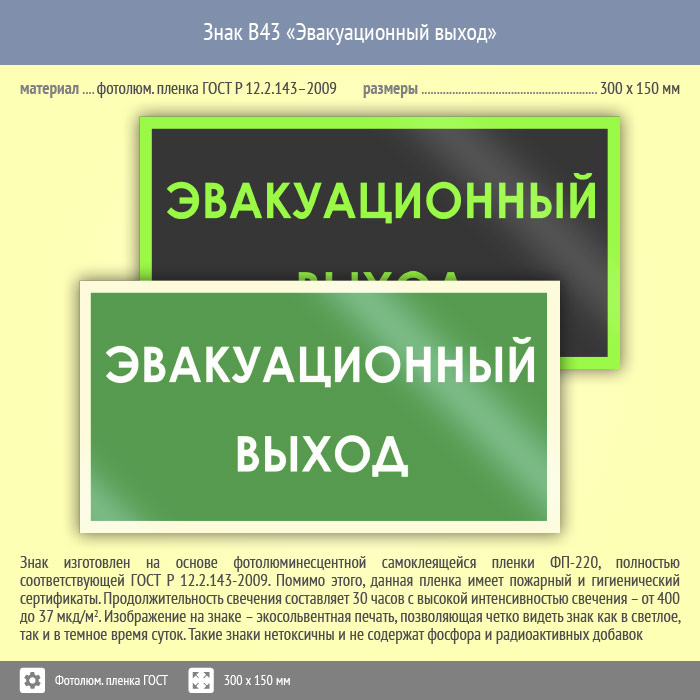 Знак B43 «Эвакуационный выход» (фотолюминесцентная пленка ГОСТ 34428-2018, 300х150 мм) в Лобне купить