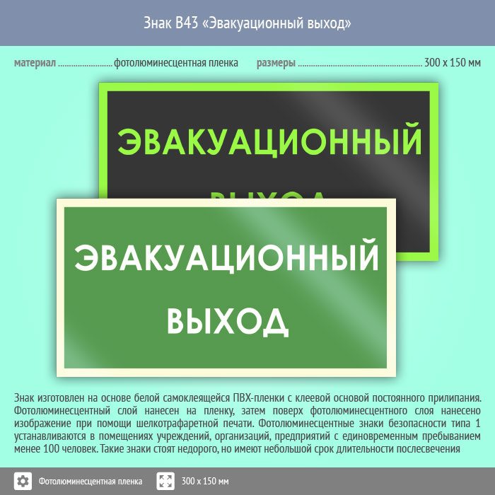 Знак B43 «Эвакуационный выход» (фотолюминесцентная пленка, 300х150 мм) в Лобне купить