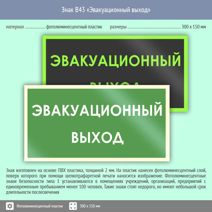 Знак B43 «Эвакуационный выход» (фотолюминесцентный пластик, 300х150 мм) в Лобне купить