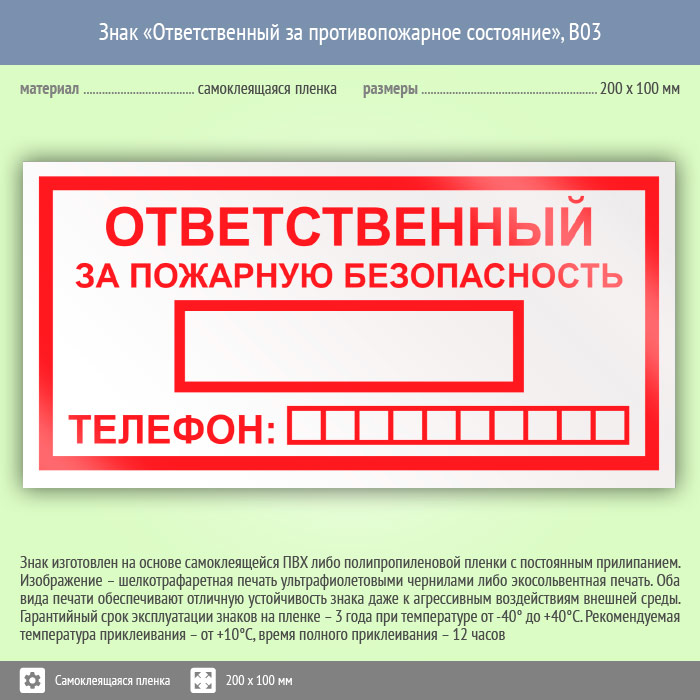 Знак «Ответственный за пожарную безопасность», B03 (пленка, 200х100 мм) в Лобне купить