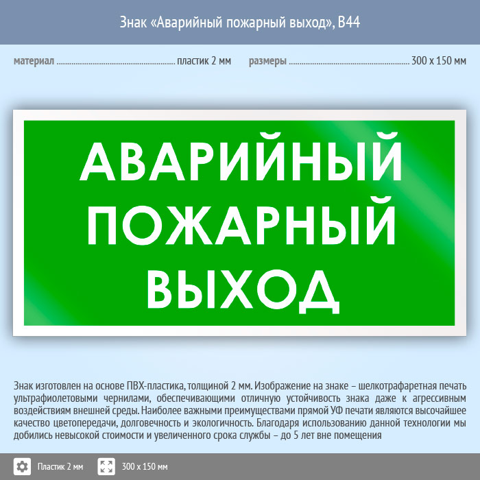 Знак «Аварийный пожарный выход», B44 (пластик, 300х150 мм) в Лобне купить