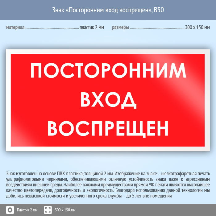 Знак «Посторонним вход воспрещен», B50 (пластик, 300х150 мм) в Лобне купить