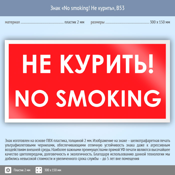 Знак «No smoking! Не курить», B53 (пластик, 300х150 мм) в Лобне купить