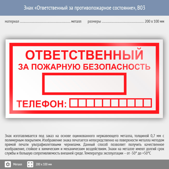 Знак «Ответственный за пожарную безопасность», B03 (металл, 200х100 мм) в Лобне купить