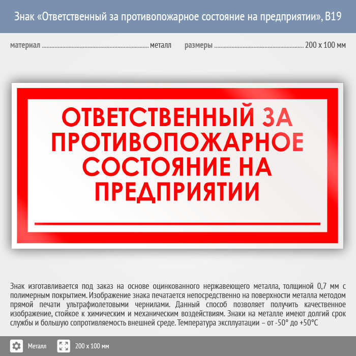 Знак «Ответственный за противопожарное состояние на предприятии», B19 (металл, 200х100 мм) в Лобне купить