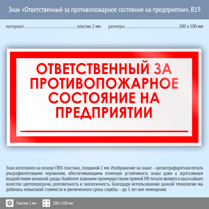 Знак «Ответственный за противопожарное состояние на предприятии», B19 (пластик, 200х100 мм) в Лобне купить