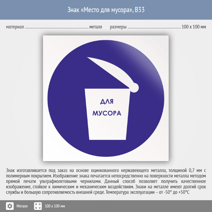 Знак «Место для мусора», B33 (металл, 100х100 мм) в Лобне купить