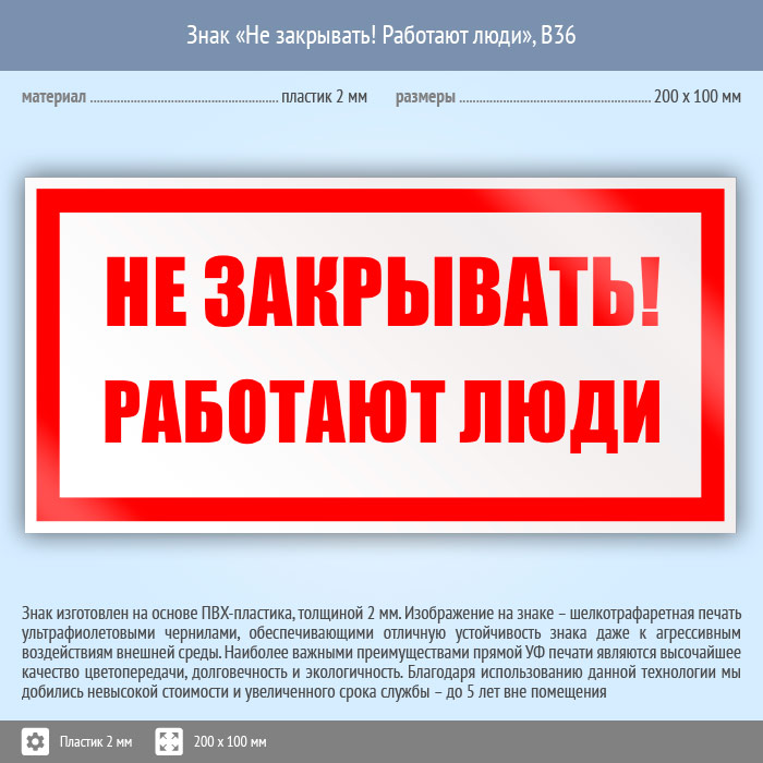 Знак «Не закрывать! Работают люди», B36 (пластик, 200х100 мм) в Лобне купить