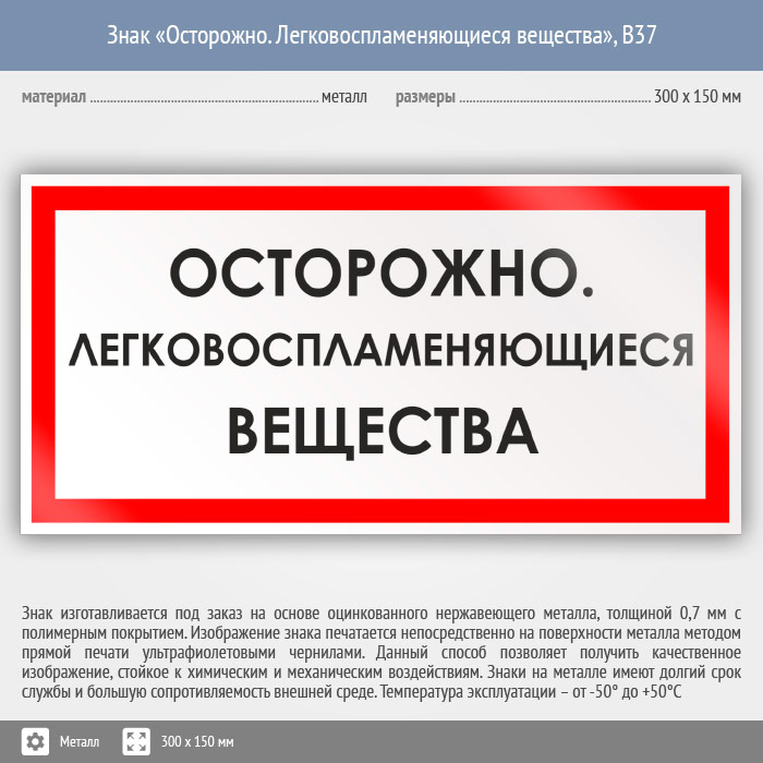 Знак «Осторожно. Легковоспламеняющиеся вещества», B37 (металл, 300х150 мм) в Лобне купить