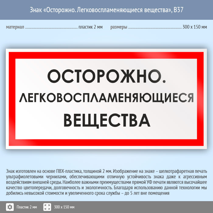 Знак «Осторожно. Легковоспламеняющиеся вещества», B37 (пластик, 300х150 мм) в Лобне купить