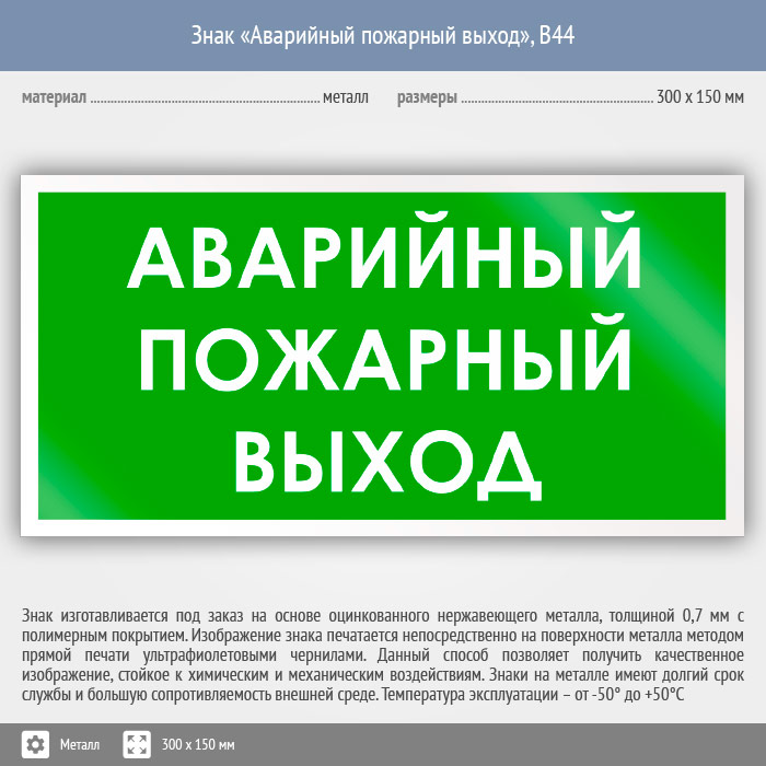 Знак «Аварийный пожарный выход», B44 (металл, 300х150 мм) в Лобне купить